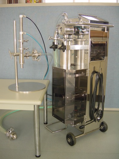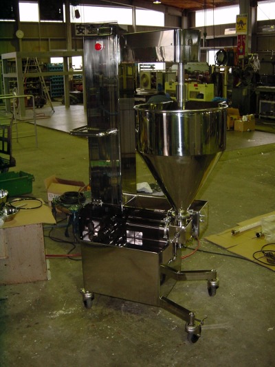 | 仕様 | 充填量 5cc~370cc/1回 充填能力 20~30回/分 精度(目安) ±0.3% 電力 AC 100V 4.5A 空圧 0.4MPa 50Nリットル/分 材質 接液部 SUS316 ロータリーバルブ等SUS304相当付属品 40リットル円錐型タンク/ピストン式ノズル/足踏みスイッチ |